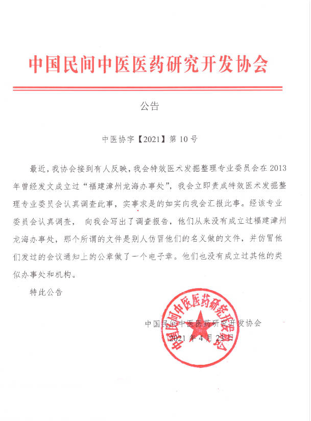 最近,我协会接到有人反映,我会特效医术发掘整理专业委员会在2013年曾经发文成立过“福建漳州龙海办事处”,我会立即责成特效医术发掘整理专业委员会认真调查此事,实事求是的如实向我会汇报此事。经该专业委员会认真调查,向我会写出了调查报告,他们从来没有成立过福建漳州龙海办事处,那个所谓的文件是别人仿冒他们的名义做的文件,并仿冒他们发过的会议通知上的公章做了一个电子章。他们也没有成立过其他的类似办事处和机构。 特此公告