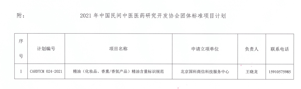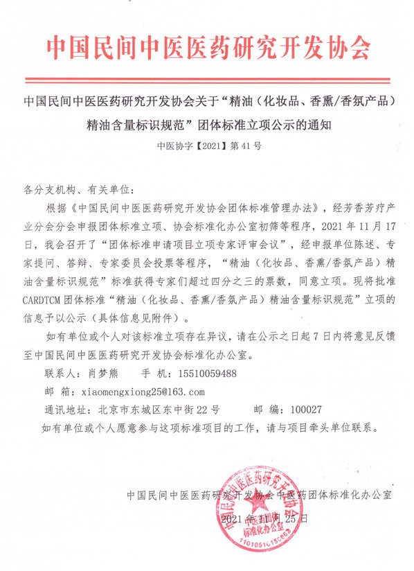 中国民间中医医药研究开发协会关于“精油(化妆品、香熏/香氛产品)精油含量标识规范”团体标准立项公示的通知